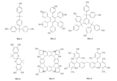 分子玻璃光刻胶是一种具有较高玻璃态转变温度的小分子有机化合物,集聚合物与小分子的优点于一身。常见的分子玻璃类化合物包括支化型、四面体型、树枝状型、杯芳烃、富勒烯、多元酚和聚噻吩。从分子结构来看,分子玻璃光刻胶与OLED材料具备诸多的相似之处。