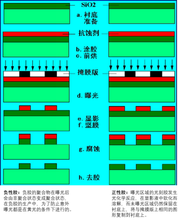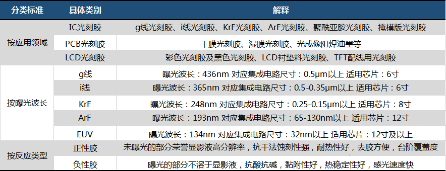 光刻胶是一类通过光束、电子束、离子束等能量辐射后,溶解度发生变化的耐蚀刻薄膜材料,在集成电路和半导体分立器件的微细加工中有着广泛的应用。根据其应用领域、分辨率、对紫外光反应特性可以进行如下分类: