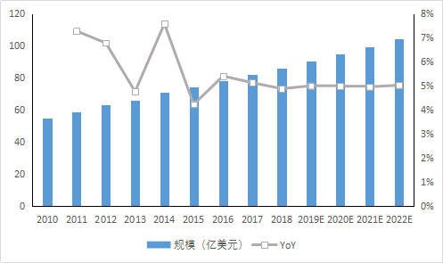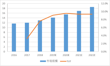 图1.16 2016-2022E全球半导体光刻胶市场规模(亿美元)