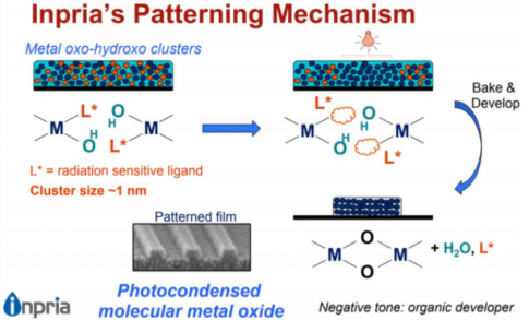 金属氧化物光刻胶为另一条具备使用潜力的技术路线,主要是美国Inpria公司研发产品为行业领先地位。金属氧化物光刻胶使用金属离子及有机配体构建其主体结构,有机配体中包含光敏基团,借助光敏基团的感光及其引发的后续反应实现光刻胶所需的性能。从化学组成来看,金属氧化物光刻胶主要为稀土和过渡金属有机化合物。