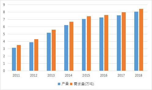 图1.15 2011-2018中国光刻胶市场产销量&2018年中国光刻胶市场下游应用比例