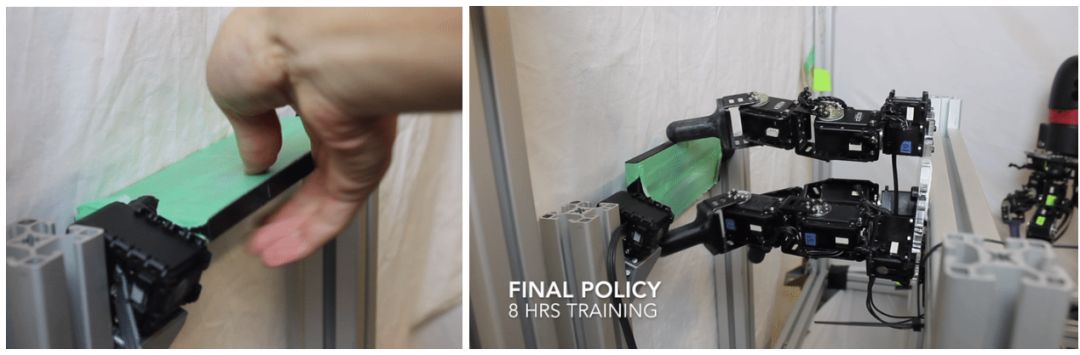 由于需要采取大量的探索行为,我们观察到机械手经常会迅速升温,而此时需要将其暂停,以免造成损坏。