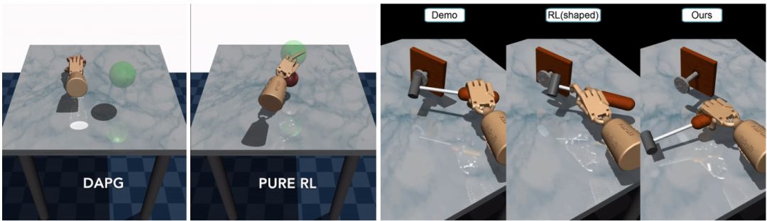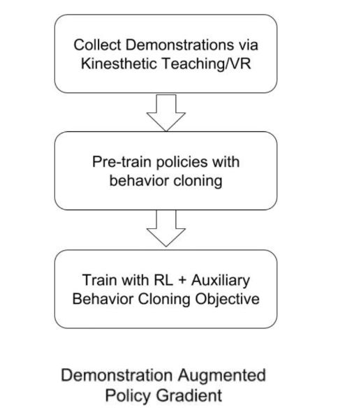 尽管模型无关的强化学习被广泛使用,然而由人类专家提供的监督信息可以帮助我们进一步加速强化学习。我们在关于演示增强策略梯度(DAPG)的论文(https://arxiv.org/abs/1709.10087)中介绍了一种将人类的演示纳入强化学习过程中从而实现上述思考的方法。在离策略强化学习、Q 学习以及其它机器人任务的环境下,人们提出了一些相关的解决方法。DAPG 背后的主要思想是,人们可以通过两种方式用演示来加速强化学习: