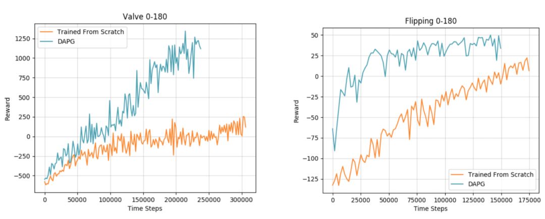 在硬件上从头开始训练的强化学习学习曲线 vs 使用 DAPG 的强化学习学习曲线。