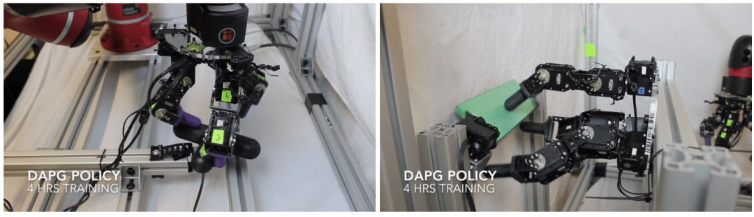 左图:使用 DAPG 方法的阀门旋转策略。右图:使用 DAPG 的方块翻转策略。