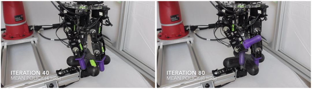 有多种算法适用于该任务。我们使用「截断自然策略梯度」(Truncated Natural Policy Gradient,TNPG)对这个任务进行学习,在真实的硬件环境下需要 9 个小时的训练时间。