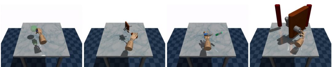 使用 DAPG 的仿真实验中学习到的行为:拾取物体、使用工具、手内操作、开门。