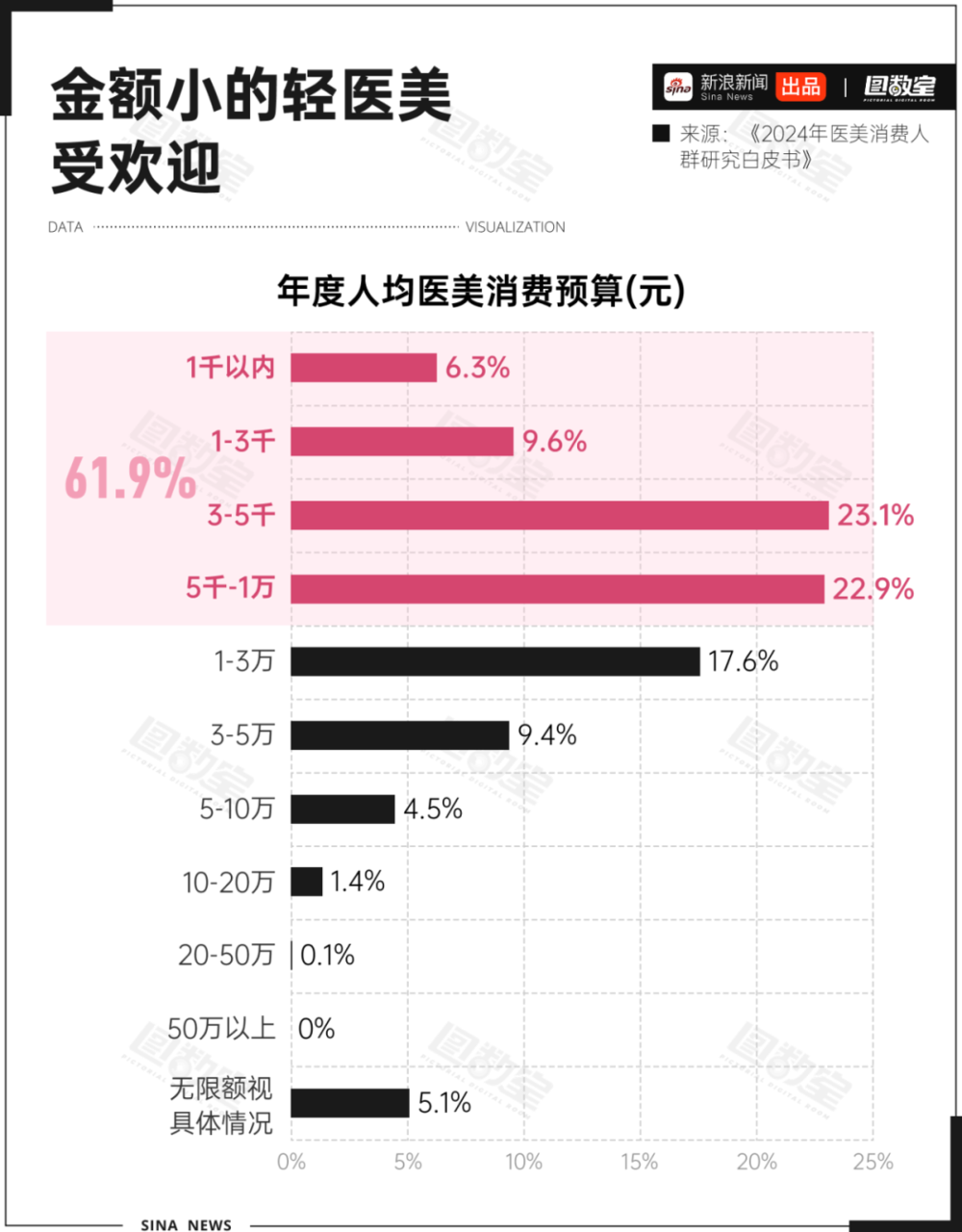 根据不久前发布的《2024年医美消费人群研究白皮书》,消费者计划在2025年用于医美消费的预算在1万以下的占比61.9%。