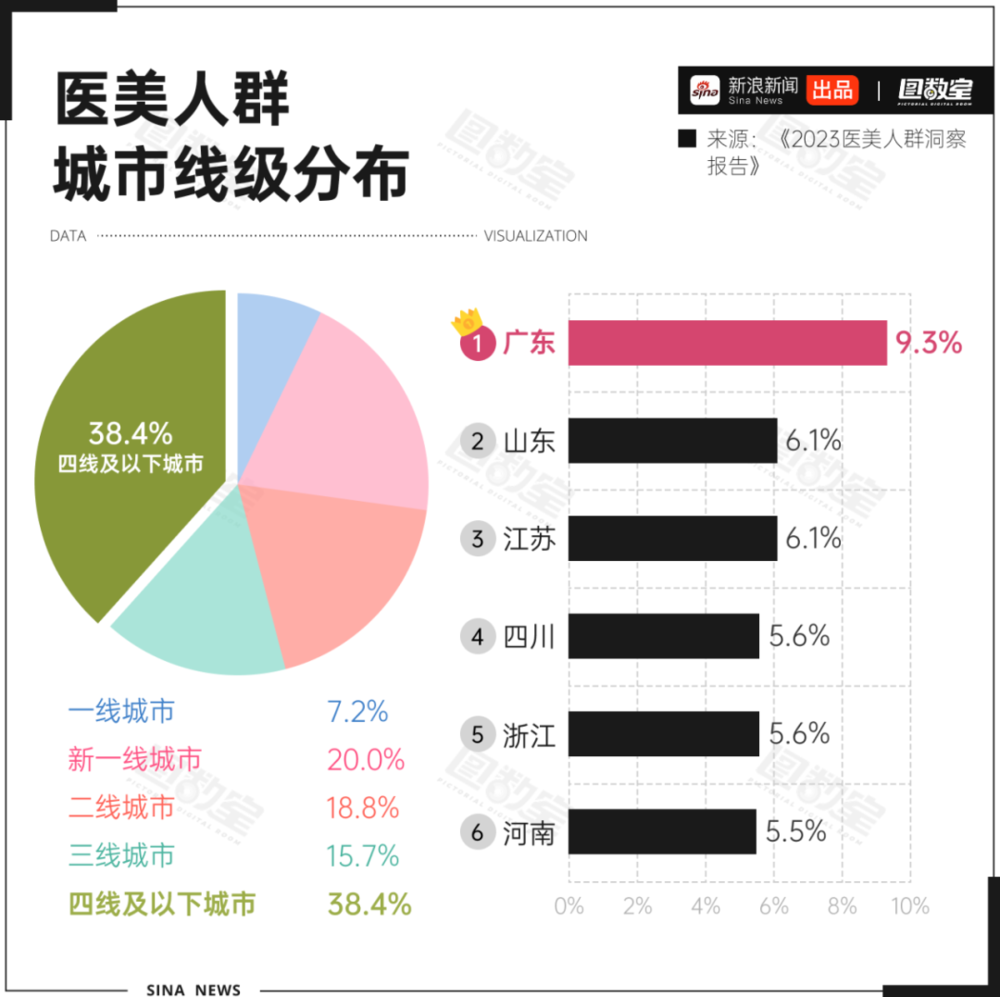 数据显示,四级及以下城市尝试医美的人群占比38.4%,位列第一。从省份分布看,广东的医美人群位列第一,其次是山东、江苏和四川。