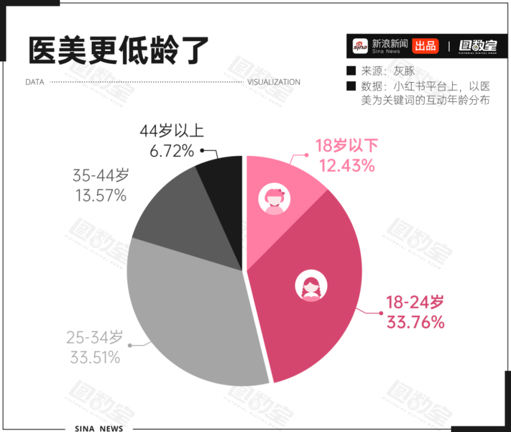 图数室在数据分析平台,以“医美”为关键词查询,发现18岁至24岁的人与医美相关内容互动的频率最高,占比为33.76%,18岁以下的未成年的占比居然也达到了12.43%。