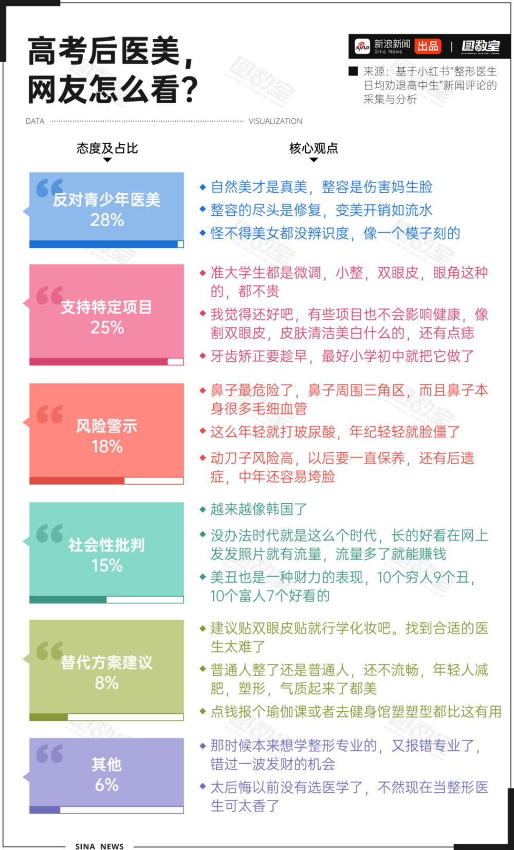 图数室对小红书上“整形医生日均劝退高中生”新闻评论进行采集分析,结果显示,近三成网友明确反对青少年医美,认为“妈生脸最为珍贵”;当然也有25%的网友支持某些特定的微调项目,如双眼皮手术、点痣、牙齿矫正等,有人还会以过来人的身份传授术后的调养经验;还有8%的网友努力寻求“美丽与开刀”之间的平衡,提出可以通过后期化妆、健身等方式提升个人魅力。