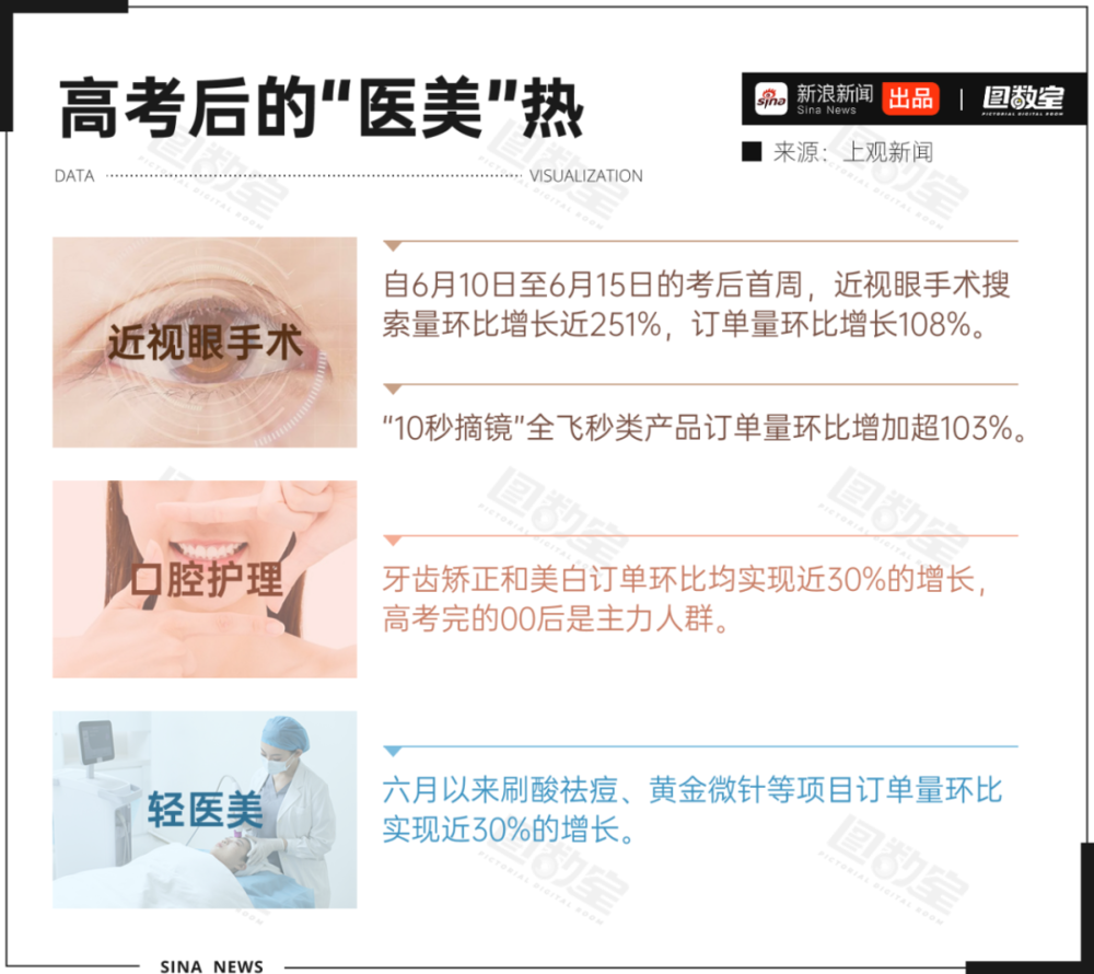 高考后学生兴起医美热潮,双眼皮手术、牙齿矫正等订单激增,主因容貌焦虑推动;调查显示超半数高中生有外表困扰,女生占比更高;医美年轻化趋势明显,18岁以下参与度达12.43%;争议围绕支持微调与反对观点;轻医美普及但风险高,投诉增14倍;最终强调理性应对变美。数据飙升:近视眼手术订单环比增长108%,牙齿美白订单......