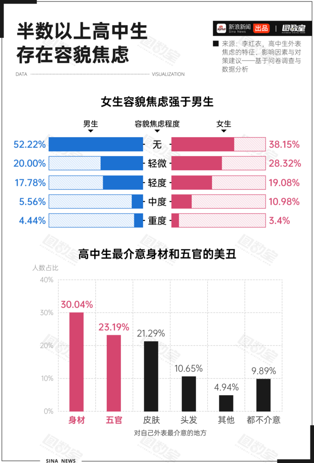 这场由00后主导的“变美运动”背后,是社交媒体放大下的容貌焦虑:调查显示,超半数高中生存在外表困扰,女生焦虑比例更高达61.85%。