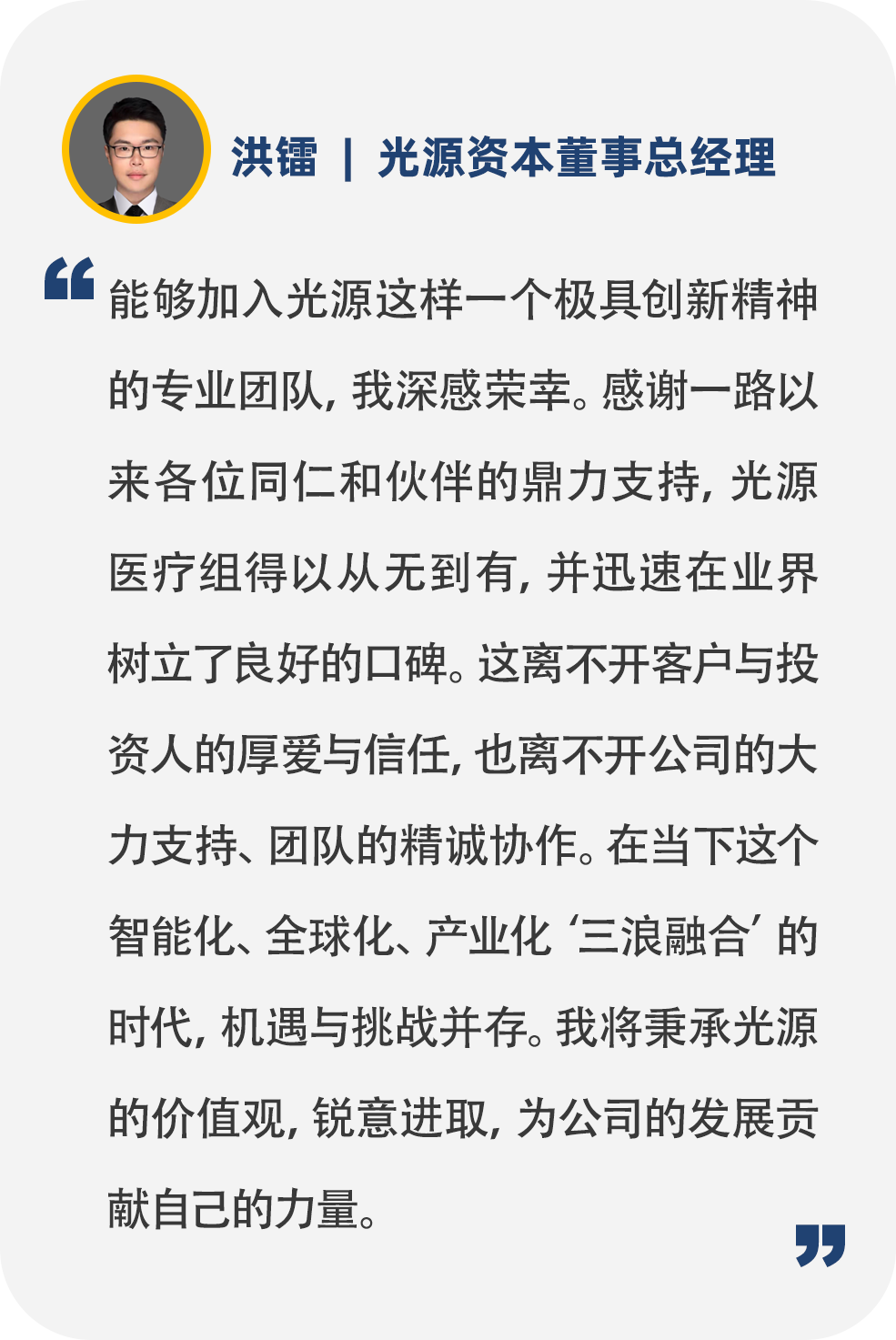 洪镭先生于 2022 年加入光源资本,专注于医疗领域私募股权融资交易。作为光源医疗行业负责人,洪镭先生凭借深厚的专业储备及丰富的投资经验,在短短两年时间内以敢于担当、奋勇开拓的精神,组建并领导光源医疗团队建设、夯实公司在医疗投融资领域的核心竞争力。两年来,洪镭先生主导了包括 Adcentrx Therapeutics、华硼中子、ENSEM Therapeutics 、羿尊生物、鞍石生物等多个国内外医疗领域标杆项目的融资。