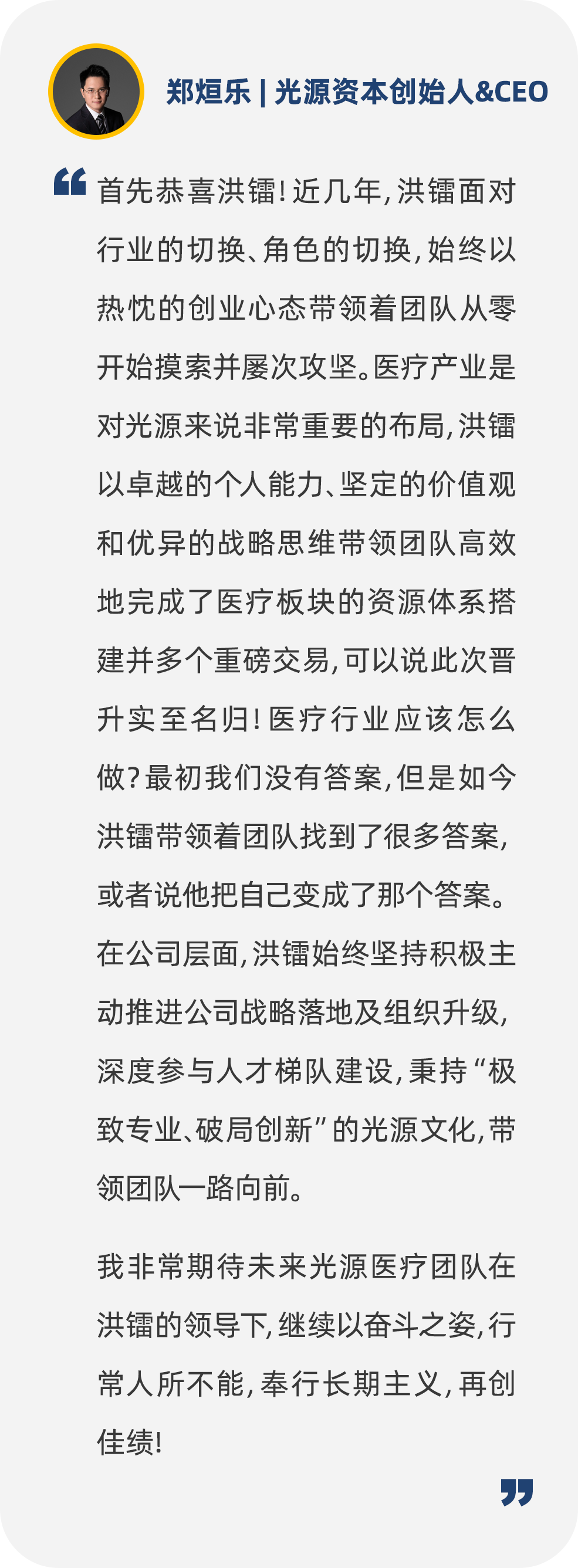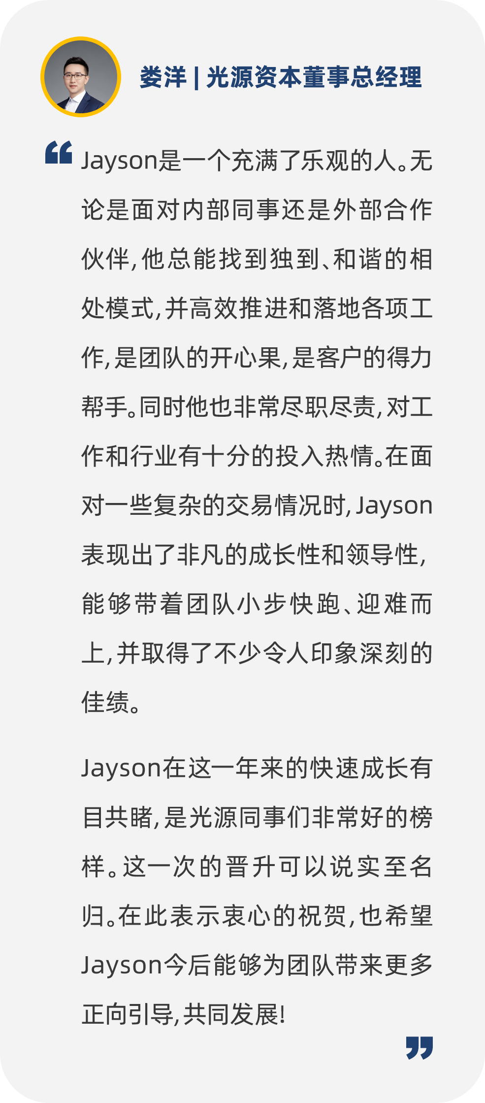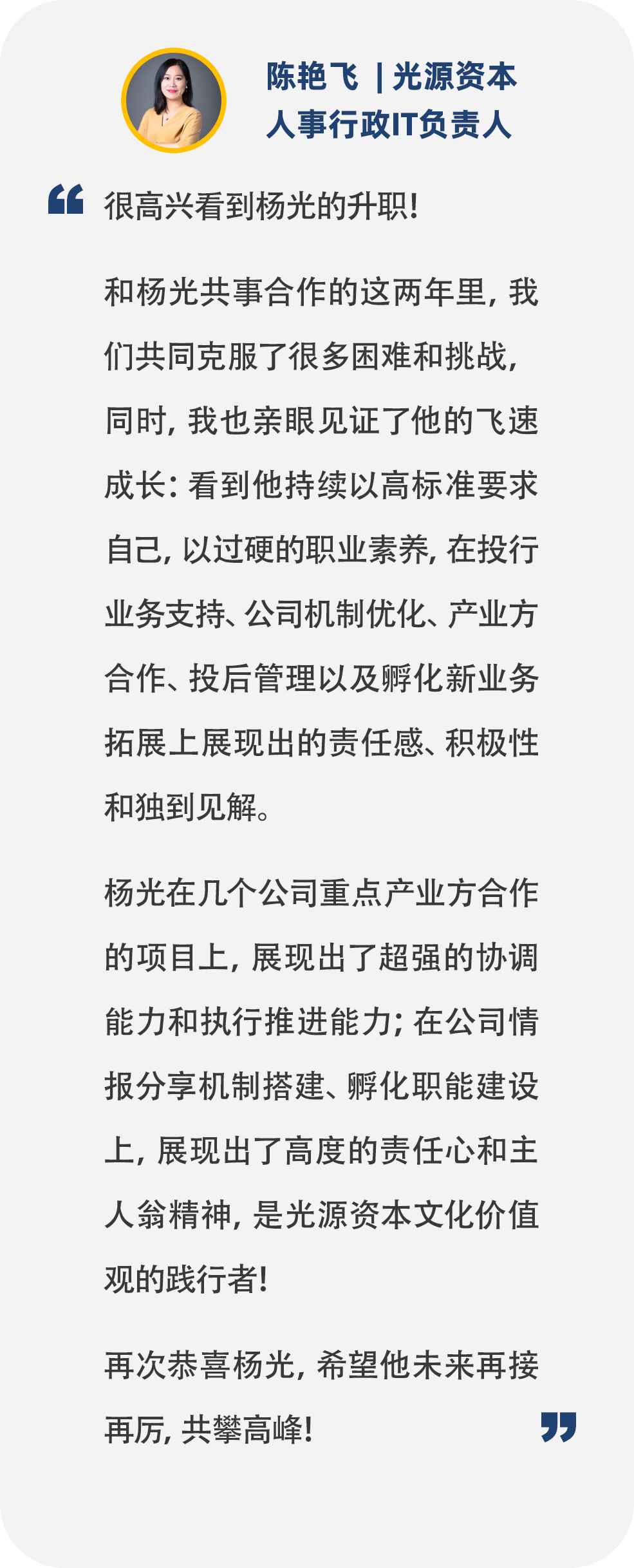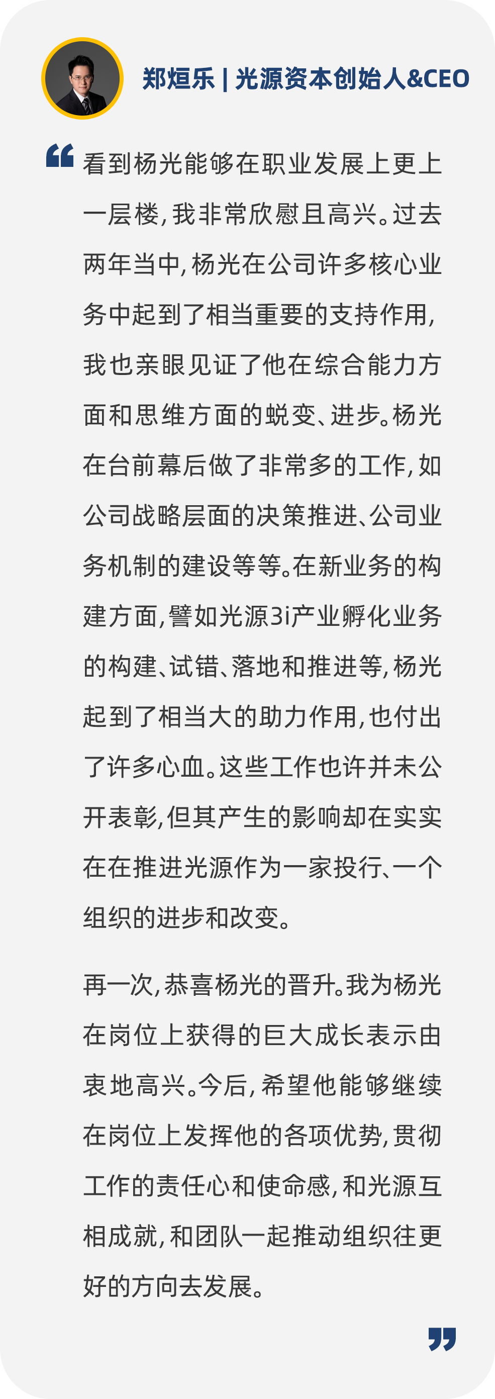 本次三位同事的晋升,是光源资本倡导的“共同创业”精神与“长期主义”在人才组织层面的直接提现,也是光源资本践行人才战略的又一例证。光源资本创始人、CEO 郑烜乐表示:“优秀的人才是企业建设的关键基石,本次洪镭、金涵旻、杨光三位核心骨干的晋升是光源人才梯队建设的重要里程碑,也展现了光源在多领域的多元化布局和人才培养。他们是优秀的核心骨干,也是光源资本企业文化的践行者。此次晋升不仅是对他们的工作态度与工作能力的表彰,更是对他们未来无限潜能的期待。希望他们在新岗位上继续发光发热,保持创新精神和极致热情,为光源开拓更广阔的未来。”