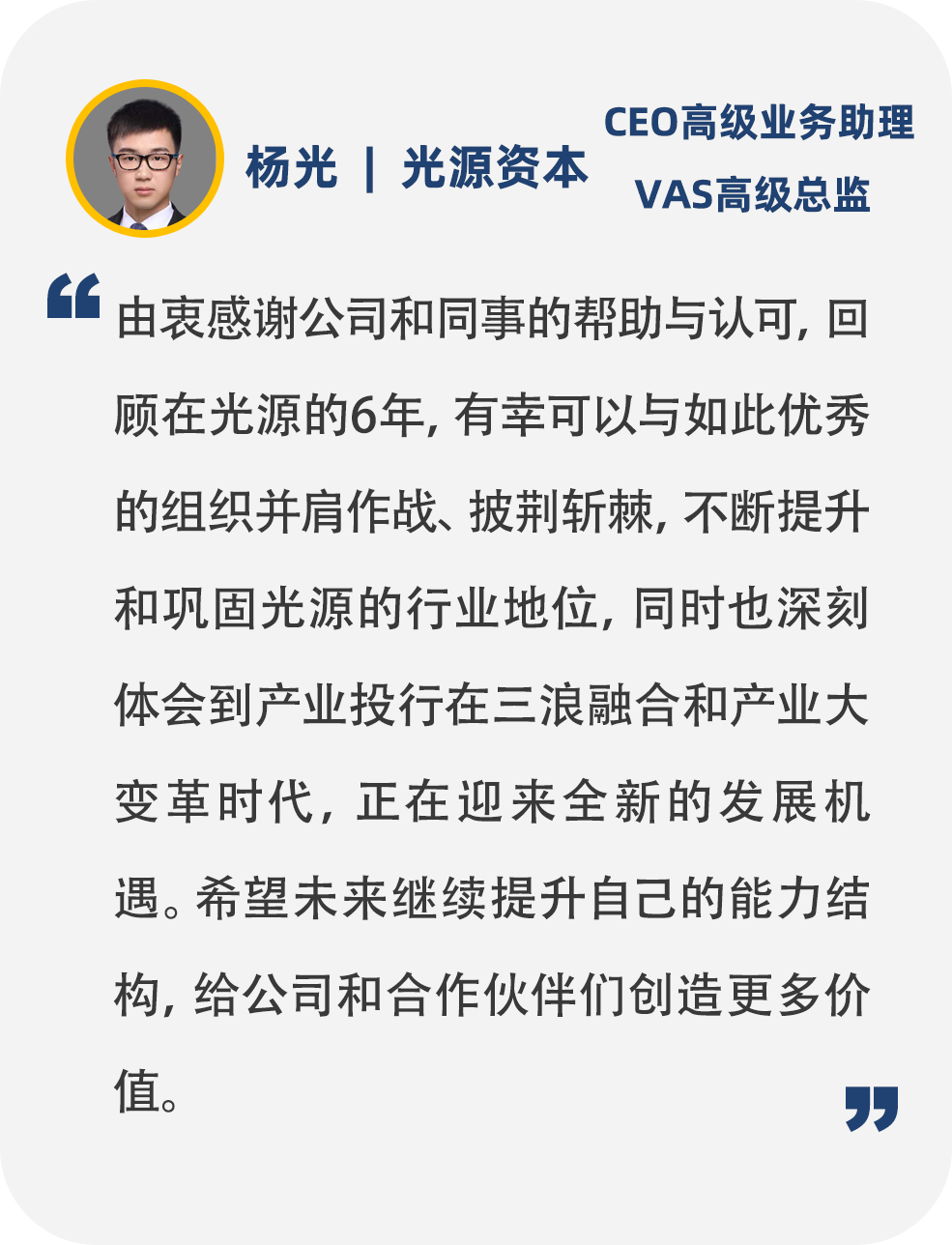 杨光先生于 2018 年加入光源资本,专注于科技、企服等领域,曾参与或主导捷配科技、瑞云冷链、擎创科技、哈啰出行、XTransfer 、华筑科技、鸭嘴兽、CertiK 、积加科技、真景科技、中废通、乐创能源、兰木达科技等项目融资。杨光先生自担任光源资本 CEO 业务助理以来,积极推动并持续支持公司战略合作、机制优化、业务拓展、中台建设等工作,为公司战略层决策的落地贡献了关键性助力作用。