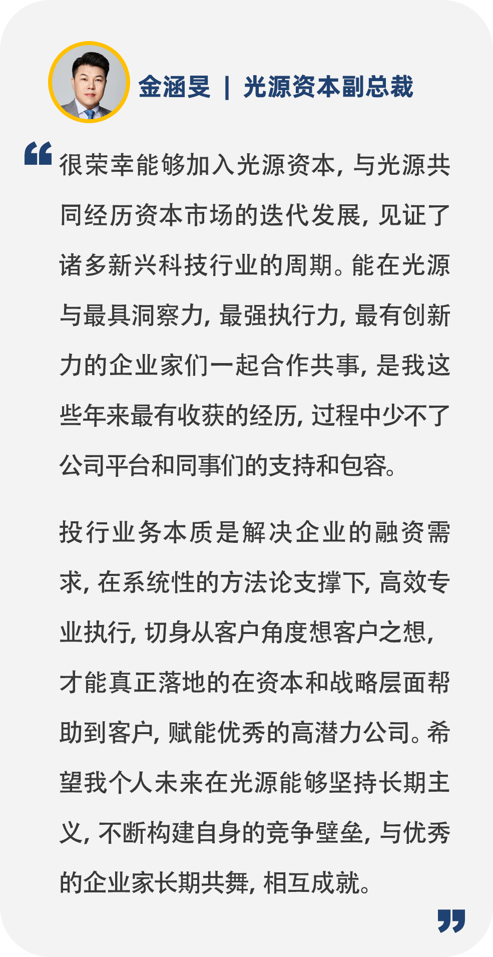 金涵旻先生专注于 TMT、人工智能、跨境出海等科技行业的私募股权和并购交易,累计交易金额超过 5 亿美金。自 2021 年加入光源后,金涵旻先生展现出了极强的专业能力与进取精神,主导并完成了包括影眸科技、爱诗科技、Oladance 等行业知名项目在内的私募股权融资及并购交易,为合作伙伴提供了专业、及时的帮助,为光源在人工智能、跨境出海等关键领域取得了关键的成绩。加入光源后,金涵旻先生也参与了光源东南亚办公室的设立和业务开展,带着多元化视野积极地为公司开拓了海外的企业以及跨国的企业集团资源,展现出了其在出海和国际化业务端的前瞻性视角与不可估量的潜力。