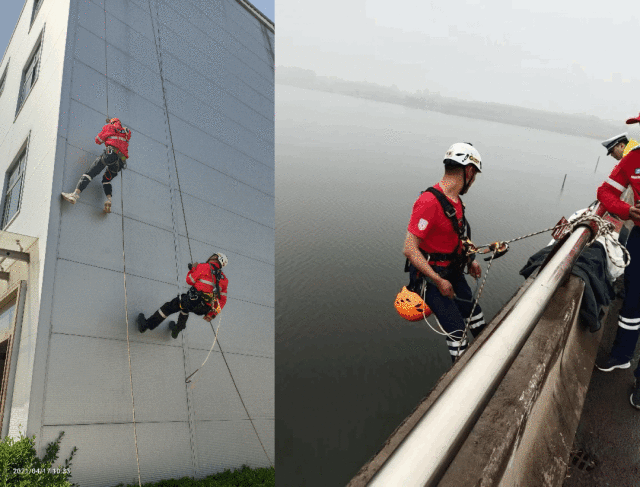 ■图/何邵舟(白帽)带领队员在一厂房外墙进行绳索技术练习(左),何邵舟在一座桥梁上进行绳索技术和水域救援相结合的演练(右)