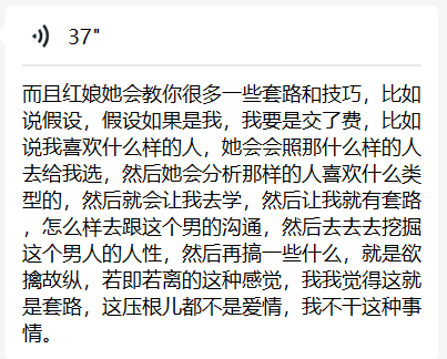 差不多一个月后,眼看着会员费就要过期了,小Y还是没找到合适的伴侣。小薇老师却从始至终保持着高频率的陪伴,还反复向小Y传授套路,“不要太老实,先摸清对方诉求,再把自己装成是那样子,这样成功概率高”。小Y觉得这不像是自己的性格,但导师反复强调“前期要相互吸引,否则以后也不会被珍惜”。