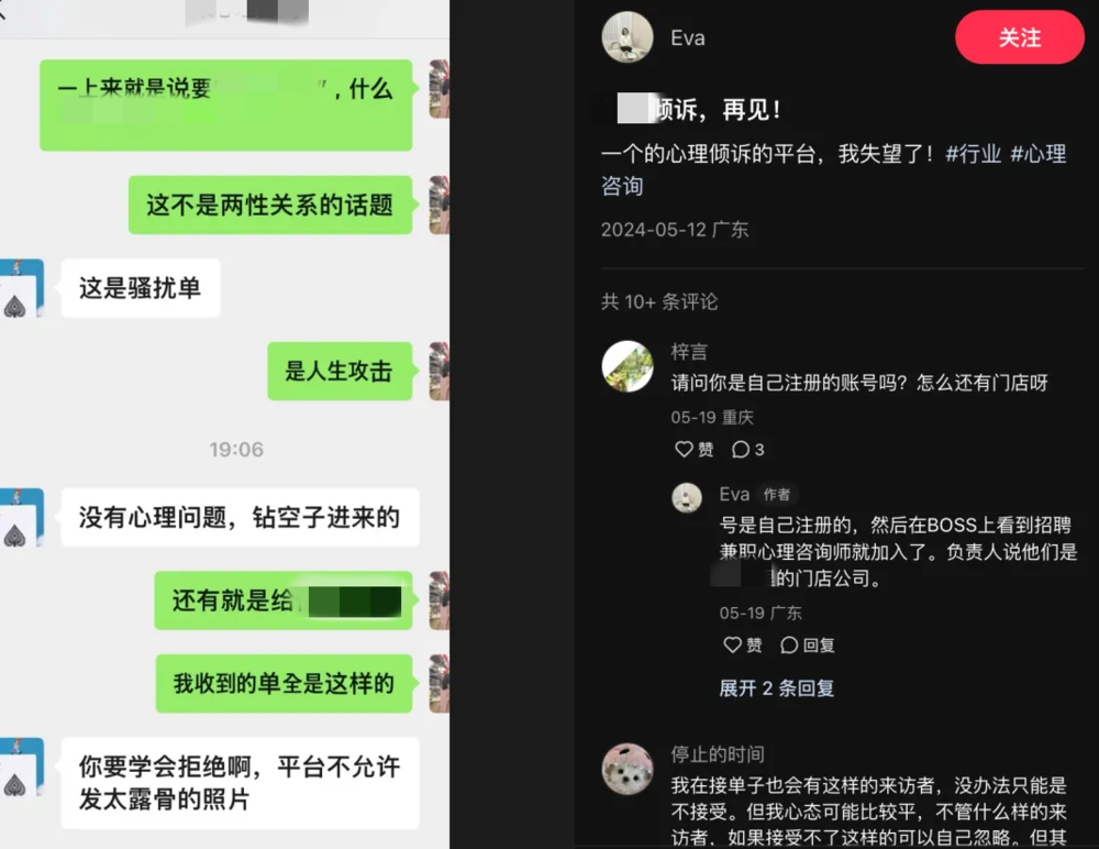 另一方面,因为平台对用户疏于把控的态度,专业的心理咨询师也在这类App上,频频受到性骚扰。最终,不论是接受服务的人,还是服务者,都得不到应有的帮助和执业环境。