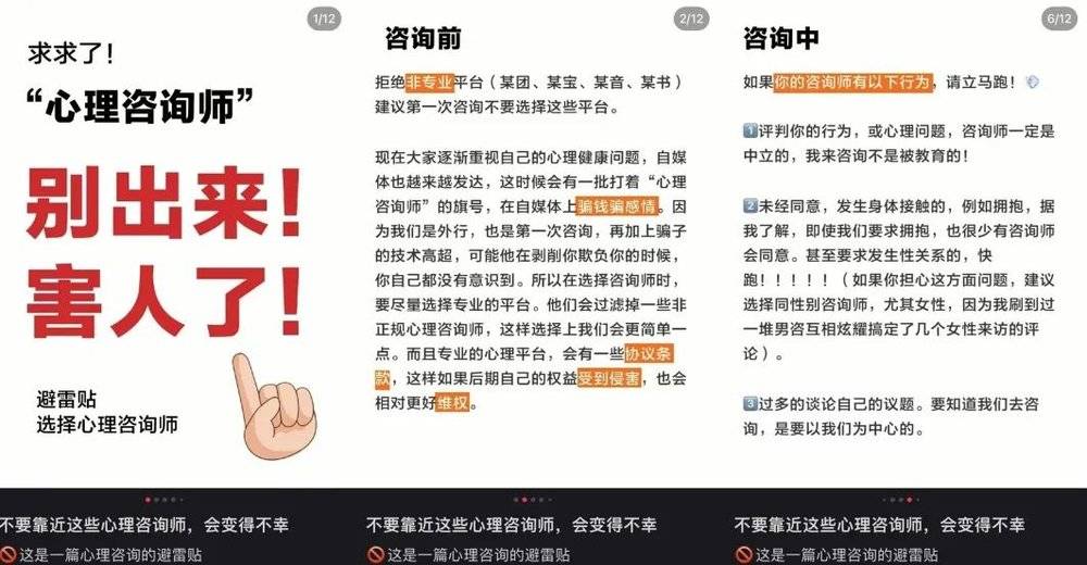 小红书博主@Sunny在自己的主页里,就详述了自己总结的心理咨询防骗指南。
