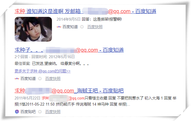 你当年用QQ邮箱求种留下的坟贴,只要别人有兴趣复制一下你的邮箱账号,上百度一搜就统统浮出水面。