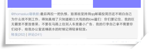 “跨国媒体人”骆轶航的创玩公司曾被来自QQ邮箱的简历挤爆,导致他怒不可遏的发出了一条微博,把用QQ邮箱、巨无霸里放香菜、在路边发小广告等一系列行为统一划分为:“看不明白真相的Low逼”。