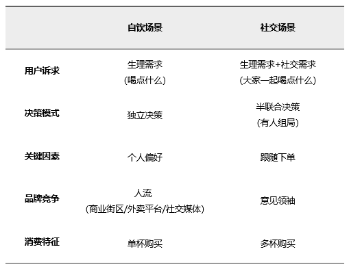 自饮场景:用户处于一种独立决策的状态,即自己决定喝什么。产品口味、个人偏好、购买便利性都是影响用户购买的重要因素,用户的消费充满了不确定性。