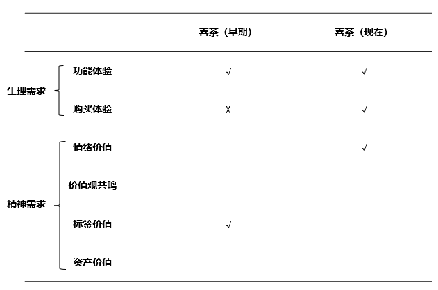 早期:喜茶早期的用户价值结构是功能体验+标签价值,良好的水果品质在当时是超越行业标准的,因此用户的体验感是极好的。品牌充分的利用了社会媒体,每开一家店都能制造出排队的轰动效应。记得上海龙之梦店刚开业时,排队2-3个小时是常态。