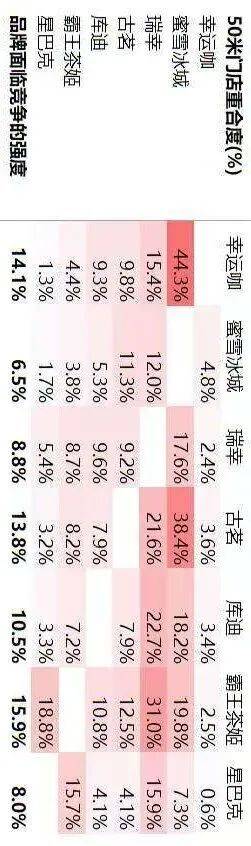 前几天,投资人朋友分享了一张图给我(如下),是关于茶饮品牌门店重合度的,从中我们解读出了很多有意思的现象: