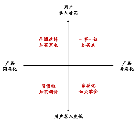 下面再次回到用户的角度,研究他们购买奶茶的过程中,会有什么样的典型特征,即用户在奶茶产品上的消费习惯是什么样的?我们认为这与两个常见的消费参数有关:产品同质化/消费卷入度。如下图,我们把用户的消费分拆为四个类型: