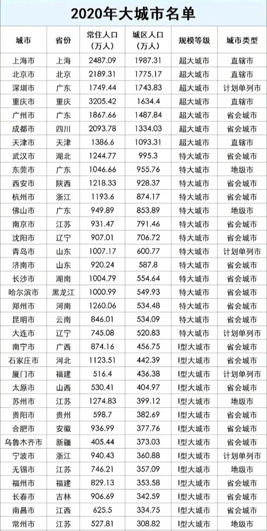 根据国务院于2014年下发的《关于调整城市规模划分标准的通知》,城区常住人口1000万以上的城市为超大城市,城区常住人口500万以上1000万以下的城市为特大城市,城区常住人口300万以上为I型大城市。图为2020年城区常住人口300万以上的大城市。(图片来源:网络)