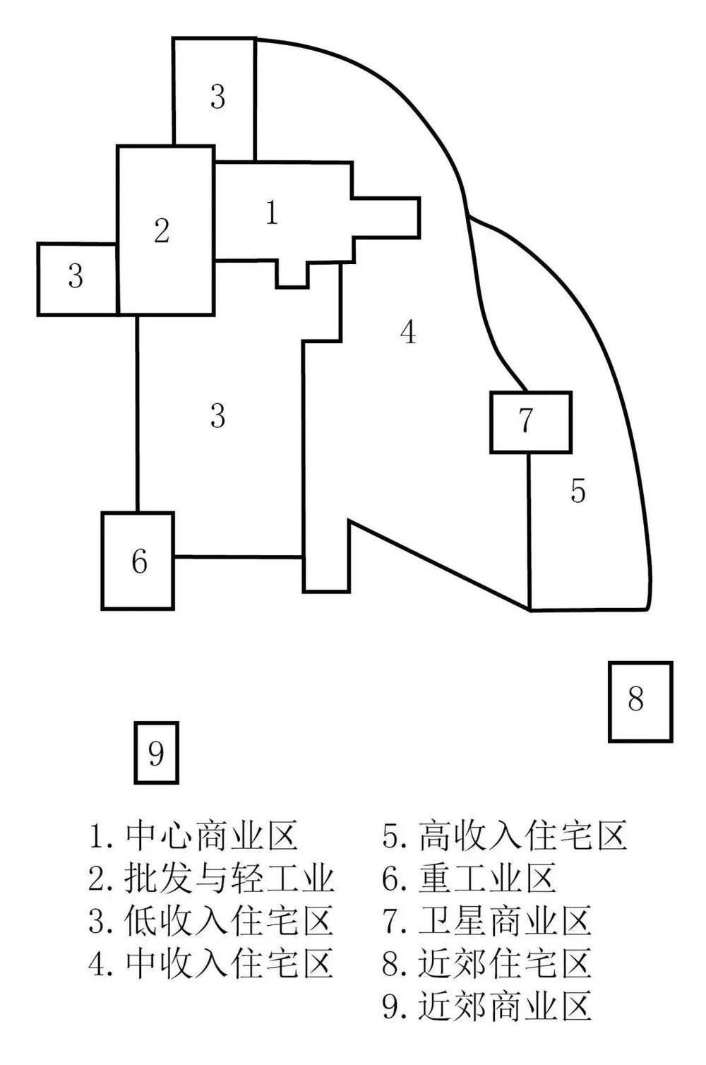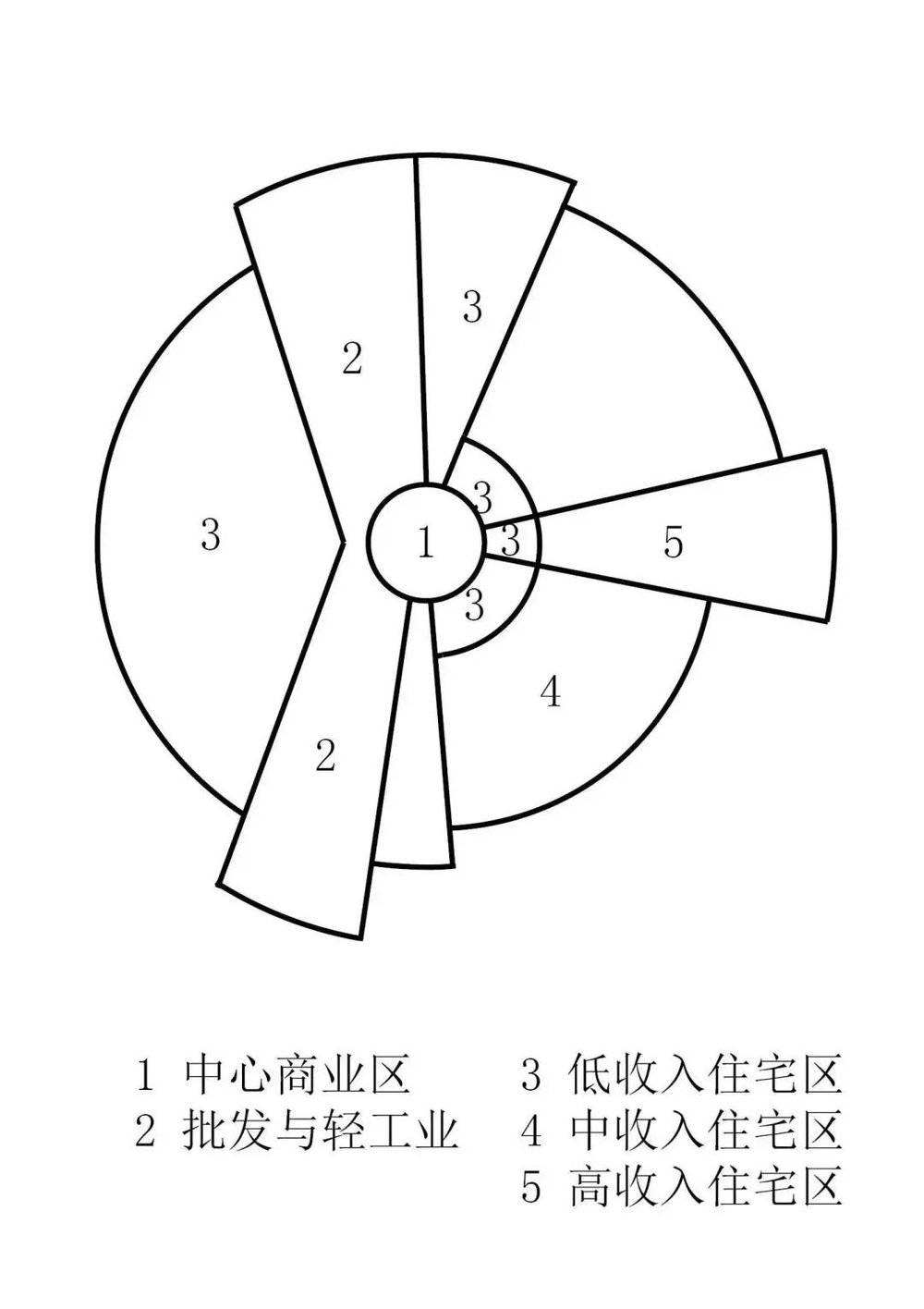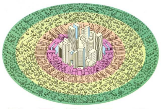 伯吉斯将城市划分为5个同心圆地带,由中心开始依次为中心商业区(CBD)、过渡性地带、工人阶级住宅区、中产阶级住宅区、高级或通勤人士住宅区。这一模型为早期的社会学家和土地经济学提供了重要来源和方法,也成为二十世纪初房地产商宣扬的城市房地产价值的模型基础。(图片来源:网络)