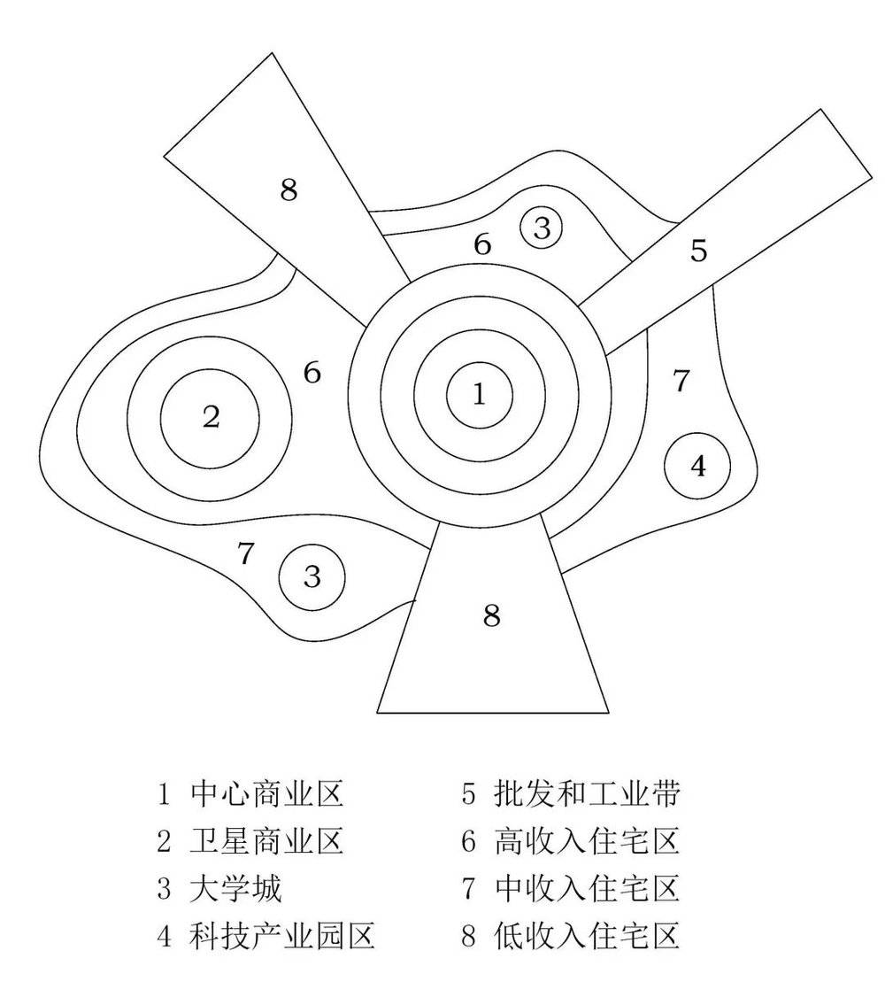 不可否认,圈层式的城市结构一定程度上是一种城市发展客观规律。早在两百年前,德国农业经济学家杜能就首次提出同心圆结构的农业区位论。他推演了一个假想的“孤立国”中的农业生产空间分布状态,认为距离中心市场的远近所导致的运费差会导致不同的农产品纯收益(杜能称之为“经济地租”),进而使不同区位存在着更为优势的土地利用方式。1925年,伯吉斯基于对大量美国城市,尤其是芝加哥的观察,将区位论推广到了城市功能布局中,奠定了最为经典的同心圆城市结构。