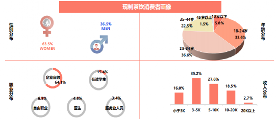新茶饮的消费者受教育程度高。白领和学生贡献超70%的比例,超过80%的消费者月均收入大于5000,随着我国消费者消费能力的提升,人们对饮品口感要求不断提高,现制茶饮相较于传统茶饮口感更好、选择更加丰富因此备受消费者青睐。