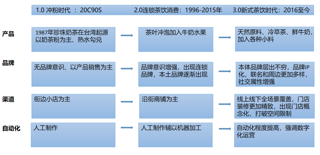 现制茶饮在2010年开始发迹,2015年起新式现制茶饮逐渐兴起,目前已经迈入消费升级2.0时代。现制茶饮从起初的网红产品逐渐下沉为人们的日常生活消费品,新冠疫情的影响下,现制茶饮线下销售受到较大的冲击,线上渠道逐渐成为主要的销售渠道,现制茶饮行业也迈入数字化发展阶段。