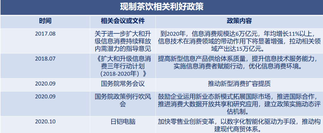 国家政策助推,国家系列相关政策利好包括新式茶饮在内的大消费行业。国家及各地方政府出台政策,提高行业渗透率,规范市场发展;新式茶饮行业成为政策红利的市场,相关报告指出新式茶饮行业有利于提高民众生活质量。