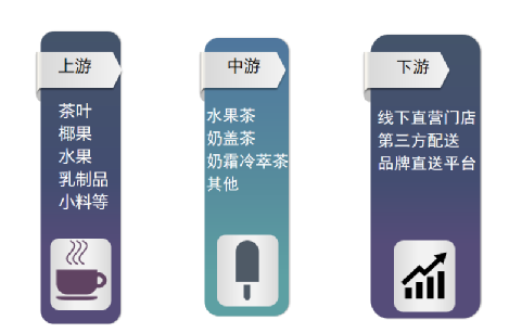 现制茶饮行业上下游分工明显,产业链布局完整,共同盈利。从现制茶饮的供应链来看,基本已经形成了固定的供应链模式。其中随着行业的发展,一些新的相关领域也加入其中,例如现在消费者喜欢添加的一些额外的Topping(加料):椰果、爆爆珠等。每一家奶茶店都会有自己的供货渠道和销售渠道。大部分是原材料供应后进行自制。