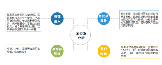 通过波特五力模型可以看出,现制茶饮行业有以下风险:进入门槛低;替代品威胁高,更新迭代雪球大;中低端产品的用户议价能力强。