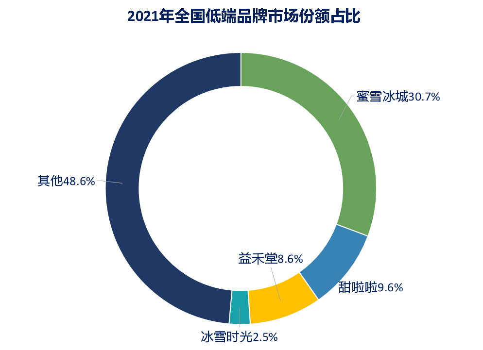 现制茶饮低端市场:蜜雪冰城断层领先,打造完整产业链修建品牌壁垒。蜜雪冰城门店数量现已突破1万家,在低端市场市占率30.7%,甜啦啦市场份额占比9.6%,益禾堂市场份额占比8.6%,冰雪时光市场份额占比2.5%。2021年,蜜雪冰城以一首“你爱我,我爱你,蜜雪冰城甜蜜蜜”推广曲强势抢占消费者心智,足见其亲民的品牌特征。