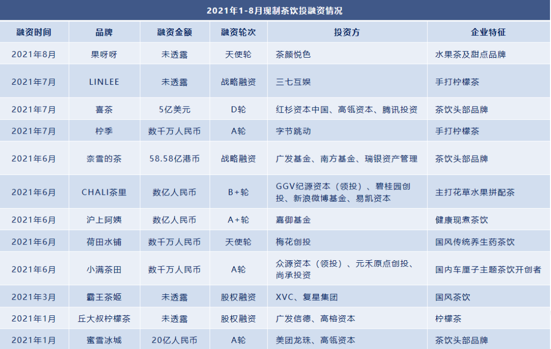 资本为行业发展注入动力,门店及品牌建设不断加码。根据奈雪的茶联合CBNData发布的《2020新式茶饮白皮书》显示,2020年,超40亿元人民币进入新式茶饮市场。除了聚焦奈雪的茶和喜茶两大头部品牌外,资本也看到更多腰部品牌,如古茗、七分甜等。