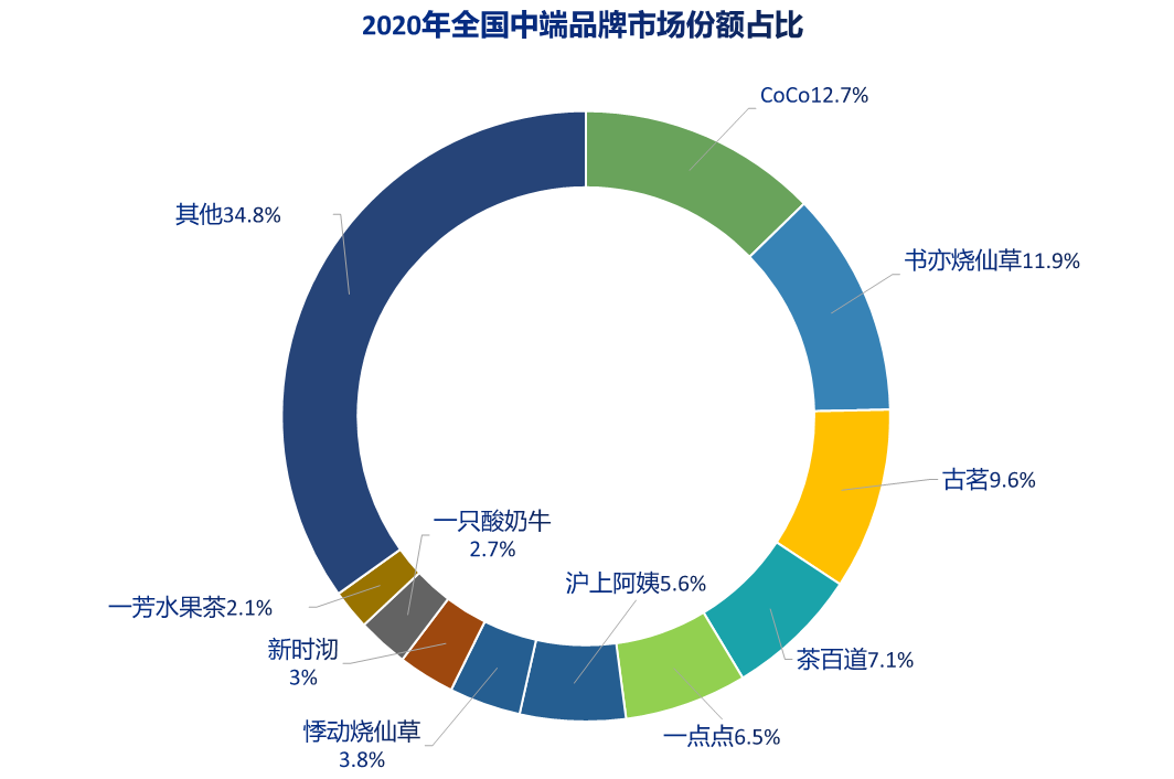 中端茶饮品牌竞争激烈,各品牌市场份额占比差距不大。其中,CoCo都可、书亦烧仙草、古茗暂时领跑。2020年,CoCo都可市场份额占比12.7%,书亦烧仙草市场份额占比11.9%,古茗市场份额占比9.6%,茶百道市场份额占比7.1%,一点点市场份额占比6.5%。