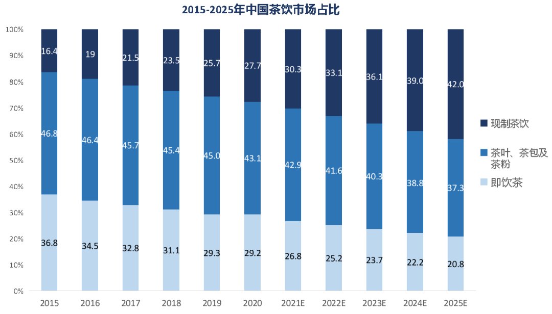 茶饮市场大致可分为现制茶饮、茶叶茶包茶粉、以及即饮茶三大细分赛道。根据灼识咨询,2015-2020年,我国现制茶饮、茶叶&茶包&茶粉以及即饮茶的CAGR分别为21.9%、8.1%、4.9%,其中现制茶饮市场规模近年实现高速增长,市场规模已逾千亿,至2020年达1136亿元(2015-20年CAGR达21.9%)。现制茶饮行业高速增长,茶饮市场占比逐步提升。
