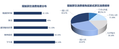 现制茶饮的社交属性日益增强。下午茶、购物和遇到开心事是新茶饮消费的三大主要场景,虽然线下到店消费依然是主流,新茶饮消费者已经逐渐习惯在线下单,到店自取的模式。2021年,76%的消费者每周都购买新式茶饮,复购率高。