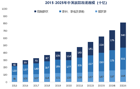 中国具备深厚的饮茶文化,整体茶饮市场规模庞大,持续保持稳定高增长。也就带动了现制茶饮发展的,成为增速最快的细分赛道。长期以来,茶一直为中国文化中的传统饮品,根据中国茶叶流通协会,我国人均茶叶消费量稳步提升。至2021年我国茶市场规模预测规模达到5450亿元。